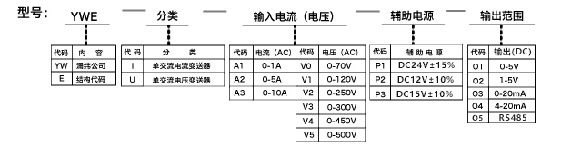 YWE-I型单交流电流变送器 输入:0~10AAC输出:4~20mADC?辅助电源:24VDC±15%