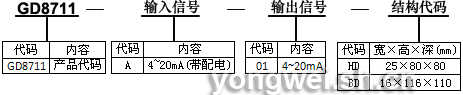 型号规格(代码):代码是指明信号输入或输出的量程范围,用户订货时可自由选定(见选型谱)